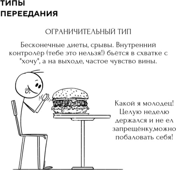Ограничительный типЗдесь, бесконечные диеты и внутренний голос: «Тебе это нельзя!» Если длительное время вы ограничиваете себя в потреблении желаемой пищи, рано или поздно происходит срыв. Ограничительный тип переедания обусловливает неизбежный срыв ввиду действия простого закона притяжения – запретный плод сладок.