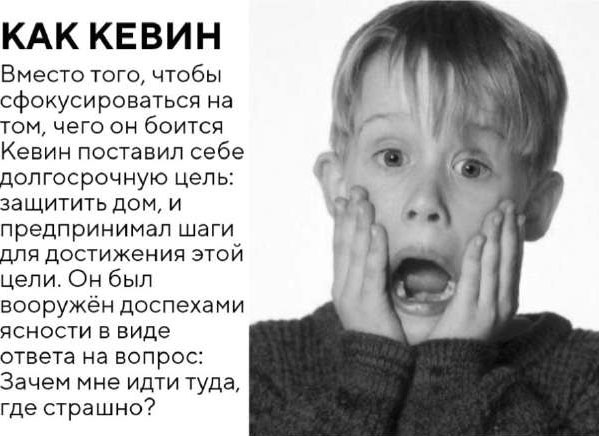 Вспомни знаменитую историю про Кевина, который остался один дома на Рождество. Как он боялся, когда впервые столкнулся с грабителями? Вспомни, как он прятался под кроватью, как страх овладевал его сердцем при мысли, что его дом ограбят? Помогло бы избегание дискомфорта ему справиться с трудностями? Ну конечно же нет, и фильм вряд ли бы вызвал такой отклик у людей. Что он сделал? Вместо того чтобы фокусироваться на том, чего он боится, Кевин поставил себе долгосрочную цель: защитить дом, и предпринимал шаги для достижения этой цели. Он был вооружен доспехами ясности в виде ответа на вопрос: зачем мне идти туда, где страшно?