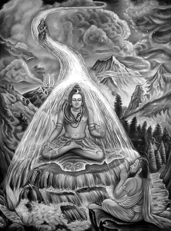 Но земля не могла принять на себя поток Ганги, только Шива – бог смерти и разрушитель, мог принять удар Ганги. Бхагирата молился в аскезе богу Шиве ещё год, пока тот не согласился принять удар Ганги на свой трезубец.