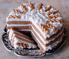 800 г мака серого обварить несколько раз кипятком, откидывая каждый раз на сито; когда вода стечет, растереть в каменной чашке; положить 200 г сладкого и 20 штук горького мелко истолченного миндаля, 400 г сахара, проварить, остудить, переложить ею бисквитный торт.