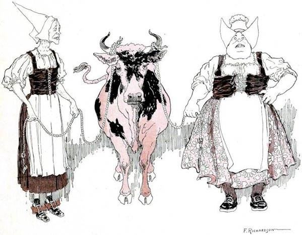 Затем пришли две старухи, одна очень толстая, а другая ужасно худая; и между собою они вели корову, толстуха обвила веревку вокруг одного рога, а худая – вокруг другого. Каждая женщина утверждала, что она хозяйка коровы, и они так громко и долго ссорились, что верховному палачу пришлось завязать им рты. Когда тишина была восстановлена, верховный советник сказал: