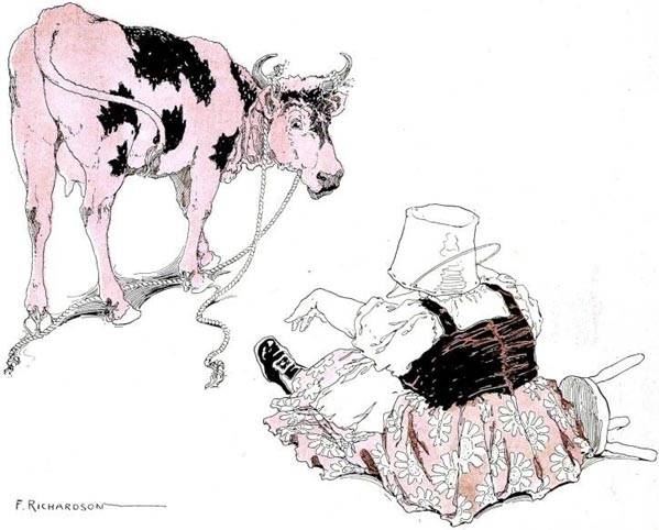 – Конечно, ваше величество, конечно! – воскликнула она; и, схватив ведро и стул, она подбежала к корове, поставила стул и села. Но прежде чем она смогла дотронуться до коровы, животное внезапно сильно лягнуло её, из-за чего испуганная женщина свалилась на пол, и ее голова застряла в ведре с молоком. Затем корова сделала несколько шагов вперед и огляделась вокруг.
