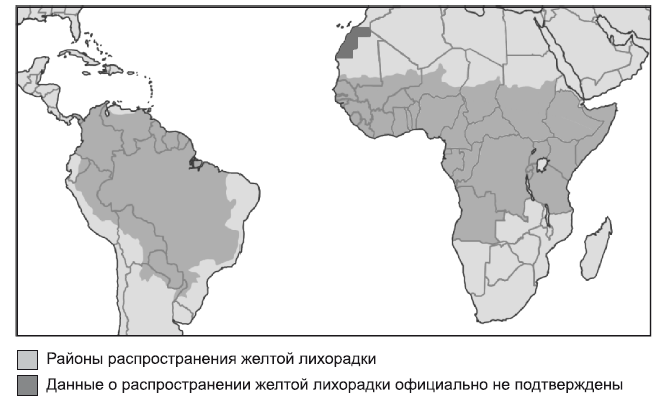Эпидемиология. Желтая лихорадка относится к карантинным болезням. Случаи заболевания желтой лихорадкой регистрируются в Центральной и Западной Африке и Южной Америке (Боливия, Бразилия, Колумбия, Перу, Эквадор и др.) (рис. 1). Переносчики – комары. Известно два эпидемиологических типа желтой лихорадки: городской (антропонозный) и сельский (желтая лихорадка джунглей). В первом случае заражение комара (Aedes aegypti) происходит при укусе больного человека в конце инкубационного периода или в первые 3 дня заболевания. При сельском типе желтой лихорадки источником инфекции являются обезьяны-мармозеты, а переносчиком – комары Aedes africanus, Aedes simpsoni. Иногда источником и резервуаром инфекции служат другие дикие животные (опоссумы, редко прочие виды). Врожденного иммунитета к желтой лихорадке не существует, переболевшие приобретают стойкий пожизненный иммунитет.