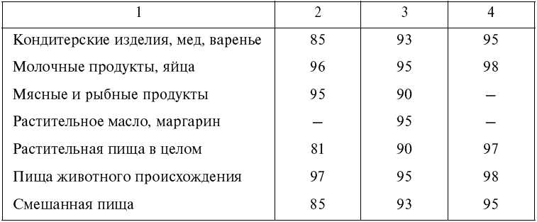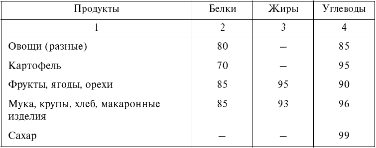 Усвояемость (табл. 1) зависит от совокупности свойств продуктов: содержания пищевых веществ, внешнего вида, вкусовых качеств, консистенции, состава и активности ферментов, температуры плавления жиров.