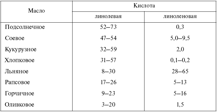 Содержание основных жирных кислот в растительных маслах, % от суммы кислот