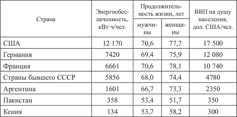 Как видно из табл. 1.1, продолжительность жизни населения различных по уровню развития стран пропорциональна удельным показателям энергообеспеченности и валового внутреннего продукта.