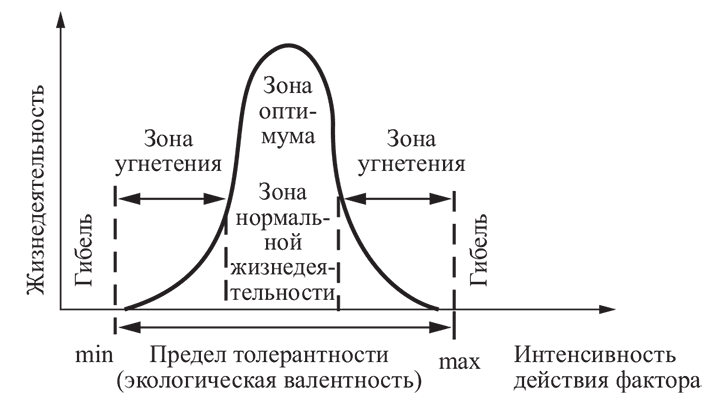 Чем сильнее отклонение от оптимума, тем больше выражено угнетающее действие данного фактора на организм (зона угнетения пессимума, или стресса). Максимально (max) и минимально (min) переносимые значения фактора – это критические точки, за пределами которых наступает смерть. Пределы выносливости между критическими точками называют экологической валентностью, или пределом толерантности живых существ к конкретному фактору среды. Представители разных видов существенно отличаются друг от друга как по положению оптимума, так и по экологической валентности.