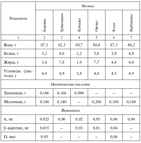 Как видно из табл. 1.1, наибольшей пищевой и биологической ценностью обладает буйволиное и овечье молоко.