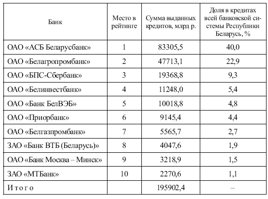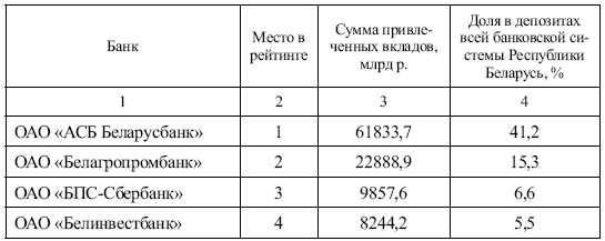 В структуре привлеченных вкладов клиентов лидерами являются ОАО «АСБ Беларусбанк», ОАО «Белагропромбанк», ОАО «БПС-Сбербанк» и ОАО «Белинвестбанк», которые занимают первые четыре лидирующие позиции соответственно. Такие же места данные банки занимают и в рейтинге предоставленных кредитов. Лидером рейтинга остается «Беларусбанк», в котором хранится 50,2 % депозитов.