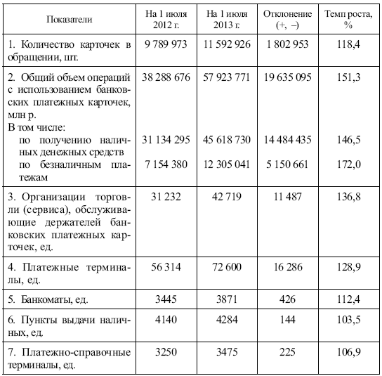 В табл. 1.3 приведена динамика показателей, характеризующих развитие системы расчетов с использованием банковских платежных карточек.