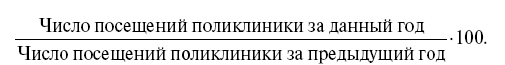 При расчете этого показателя число посещений за предыдущий год принимается за 100 %, поэтому рассчитанный показатель характеризует темп роста. Разница полученного показателя от 100 будет указывать, на сколько процентов увеличился или снизился объем посещений поликлиники в данном году (темп прироста).