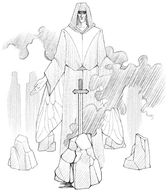 Они завернули за угол и проследовали мимо группы людей в темно-зеленых балахонах. Парни и девушки держались за руки, сомкнув кольцо вокруг камня. Меч, застрявший в тверди, источал черный дым, а из трещин сочилась темная густая кровь. Только сейчас Макс понял, что один из этих «людей» и не человек вовсе: хотя бы потому, что за его спиной трепетали крылья, похожие на стрекозиные, а на лице слишком ярко проступали скулы, делая его совершенно неестественным.