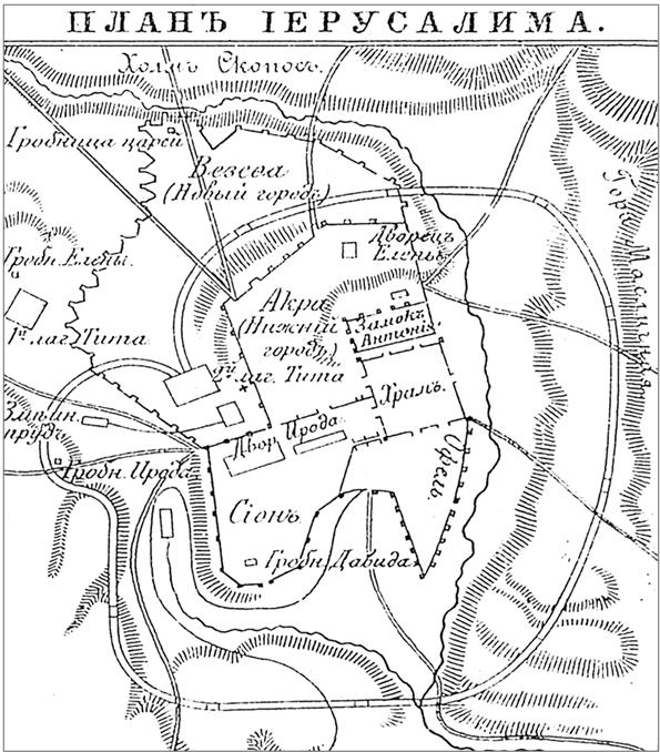 С горы Скопас, на четверть часа ходьбы от северной стены, Тит обозревал обширный город и думал, как бы ему легче разрешить трудную задачу. Перед ним находилась одна из сильнейших крепостей, или, лучше сказать, несколько крепостей, соединенных вместе (см. План Иерусалима).