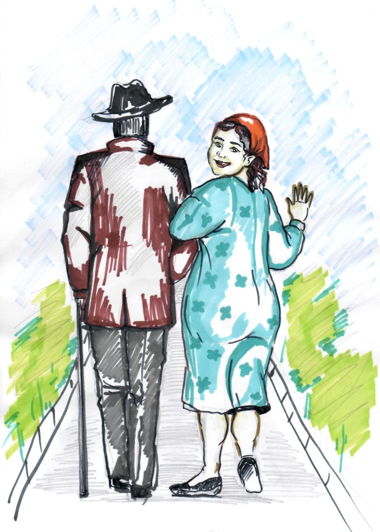 Вдоль улицы решительными движениями, подволакивая неработающую ногу, двигался наш знакомый. Добежав до него, девочка начала атаковать его предложением помощи, на что он лишь отмахивался.