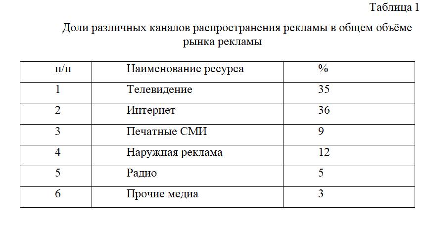 Но прежде, рекомендую вам ознакомиться с таблицей, которая отражает объем каждого вида рекламы в общей массе рынка.