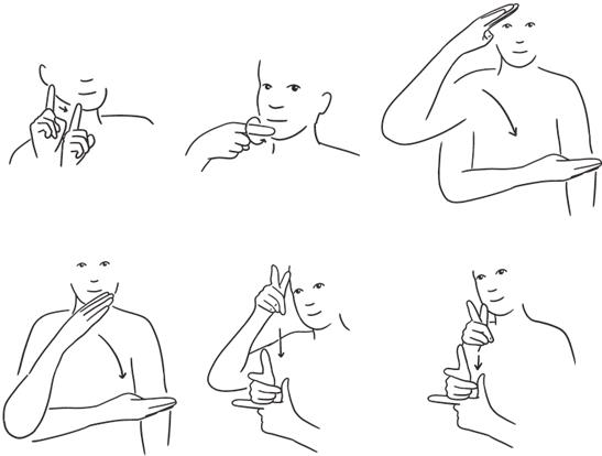 Имя: дважды стукнуть сомкнутыми указательным и средним пальцами одной руки по указательному и среднему пальцу второй.