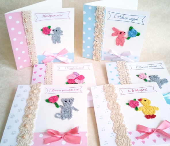 Вязаные открытки с милыми животными и вязаной тесьмой, выполненные вами вручную, станут неповторимым и уникальным сувениром для ваших родственников и друзей.