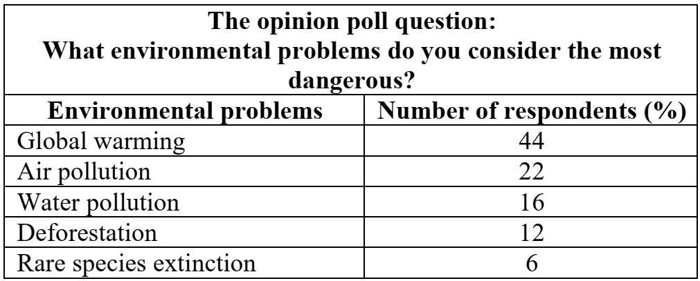 38.1 Imagine that you are doing a project on what environmental problems Zetland teenagers consider to be the most dangerous. You have found some data on the subject – the results of the opinion polls (see the table below).