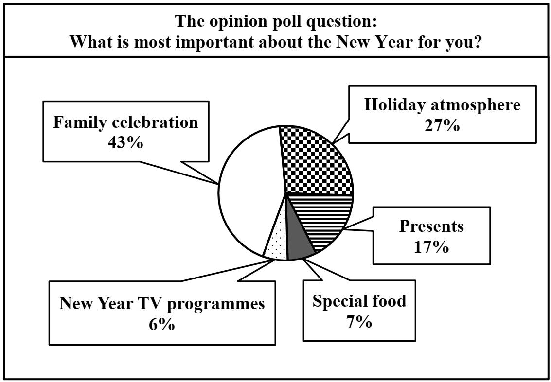 Imagine that you are doing a project on what is most important about the New Year celebration for Zetlanders. You have found some data on the subject – the results of the opinion polls (see the pie chart below).