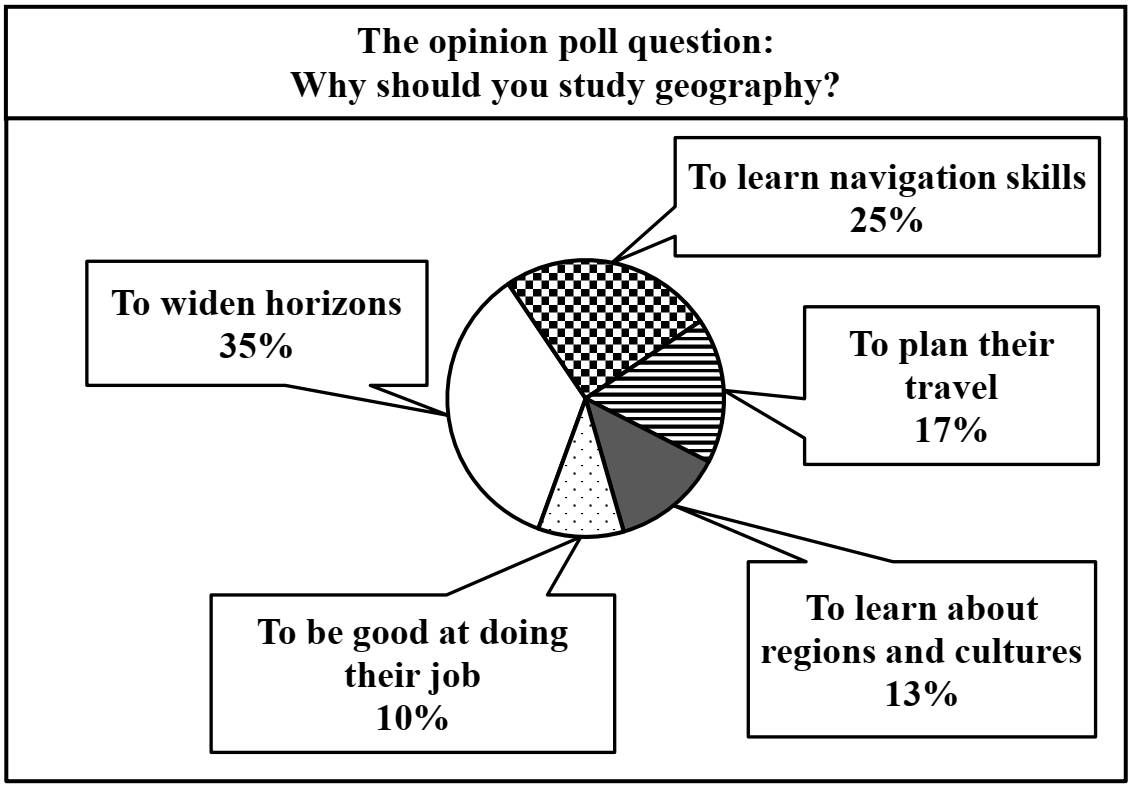 38.2 Imagine that you are doing a project on why people should study geography in Zetland. You have found some data on the subject – the results of the opinion polls (see the pie chart below).
