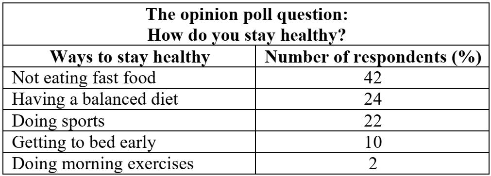 38.1 Imagine that you are doing a project on how people stay healthy in Zetland. You have found some data on the subject – the results of the opinion polls (see the table below).