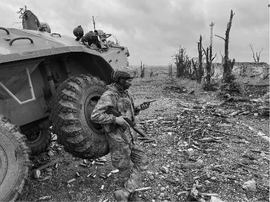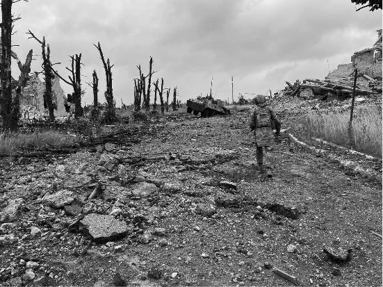 Перед улицей Шевченко сворачиваем направо, вдоль сгоревшего «Порт-Сити» и трамвайных путей. Троллейбусные и трамвайные провода висят и валяются лохмотьями, между поваленными столбами дорога вьется змейкой. Девятиэтажные дома по левую руку – сгоревшие. На перекрестке с Троицкой, перед церковью, сворачиваем налево. Огромная куча сгоревшей коммунальной техники – видно, что здесь был сильный бой, все очень сильно покорежено и на скорую руку раздвинуто так, чтобы можно было проехать. Предполагаю, что выезд был перегорожен грузовиками городских служб, чтобы никто ни мог не выехать, ни заехать, пока не приехали танки и не заехали, уже не спрашивая.