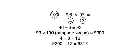 Ja mēs reizinātu ar 9,6 un 9,7, atbilde būtu 93,12. Šis fakts var palīdzēt mums atrast veidus, kā vēl vairāk vienkāršot aprēķinus, kas citādi nebūtu tik acīmredzami. Drīzumā aplūkosim šīs iespējas. Tagad mēģiniet pats atrisināt šādus piemērus: