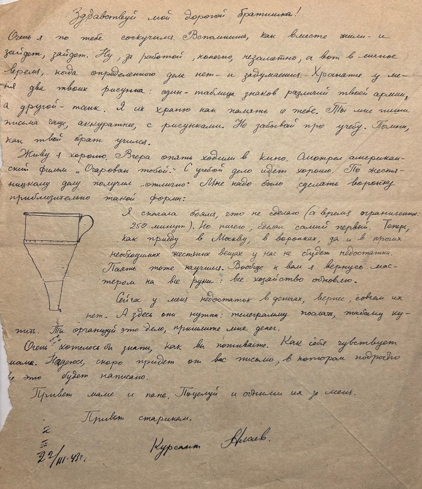 Очень я по тебе соскучился. Вспоминаешь, как мы вместе жили – и зайдет, зайдет. Ну, за работой, конечно, незаметно, а вот в личное время, когда определенного дела нет – и задумаешься. Хранятся у меня два твоих рисунка: один – таблица знаков различий твоей армии, а другой – танк. Я их храню, как память о тебе. Ты мне пиши письма чаще, аккуратнее, с рисунками. Не забывай про учебу. Помни, как твой брат учился.