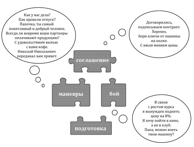 В переговорах, по аналогии с военным искусством, можно выделить два этапа: бой и маневр.