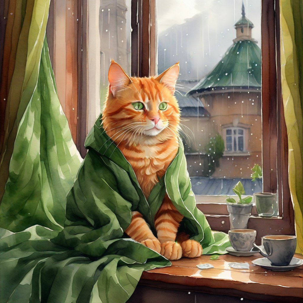 Но вдруг что-то за окном заставило его приподнять свои мягкие, пушистые усы. Мимо проходила собака в забавной шапке и ярко-жёлтом плаще – видимо, решила прогуляться, несмотря на непогоду. Она шла в сторону лужи, не видя ее за большим капюшоном.