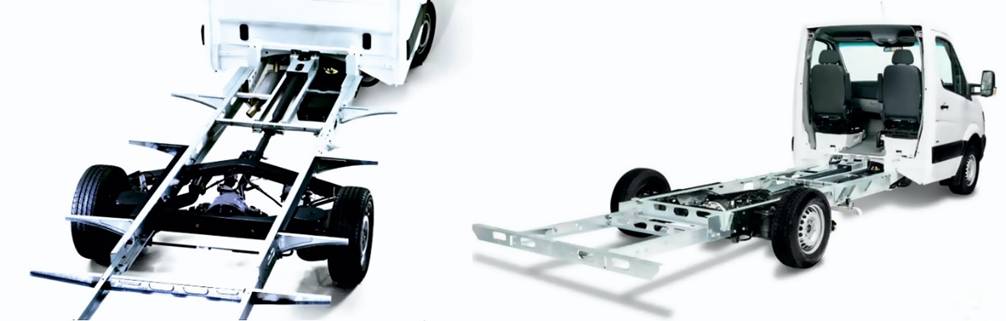 Рисунок 3.8. Заднеприводное шасси «Mercedes-Benz» подготовленное для производства автодома. Слева- на раме стороннего производителя. Справа – удлинение основной заводской рамы.