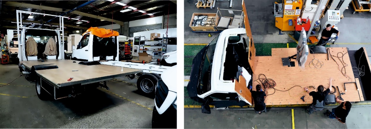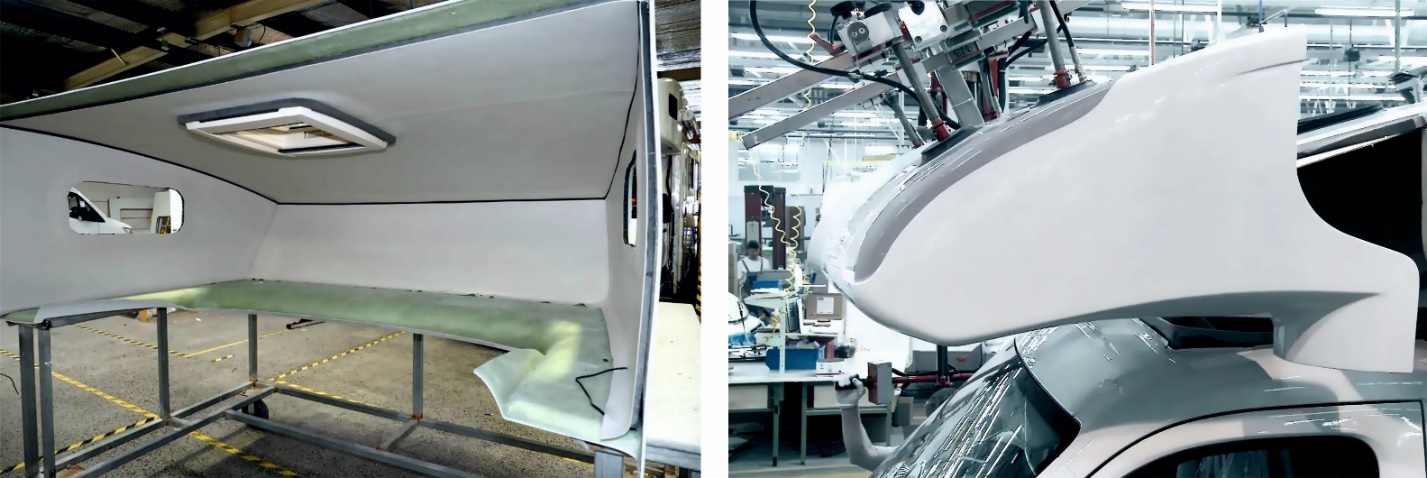 Рисунок 3.18. Завершающие этапы постройки без альковного автодома: слева установка аэродинамического обвеса «Hymer». Справа: монтаж крыши жилого дома «Corado».