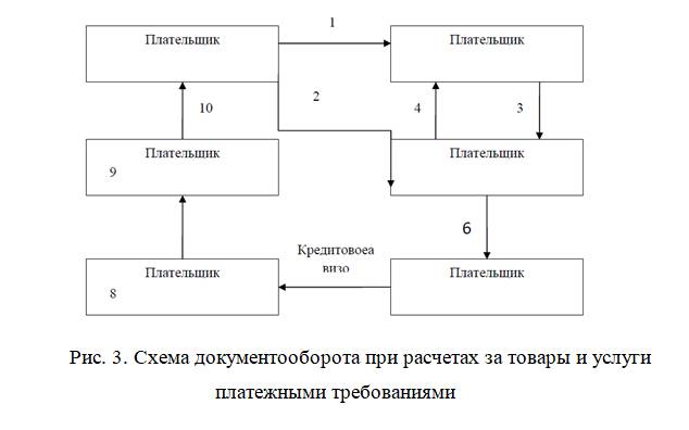 Платежное требование является расчетным документом, содержащим требование кредитора по основному договору к должнику об уплате определенной денежной суммы через банк. Платежные требования применяются при расчетах за поставленные товары, выполненные работы, оказанные услуги, а также в иных случаях, предусмотренных основным договором. Схема документооборота приведена на рисунке 3.