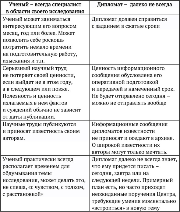 Определяя качества, присущие дипломату, следует четко представлять себе, чем они отличаются от качеств ученых, «доцентов с кандидатами». И те, и другие собирают фактический материал, изучают его, делают выводы. Третий или второй секретарь в посольстве готовит информационные документы, сотрудник научного института – статьи или монографии, студент Дипломатической академии, МГИМО или факультетов международных отношений других вузов – курсовые и выпускные квалификационные работы. В чем разница? Кое-что должно стать понятным из ниже приведенной таблицы: