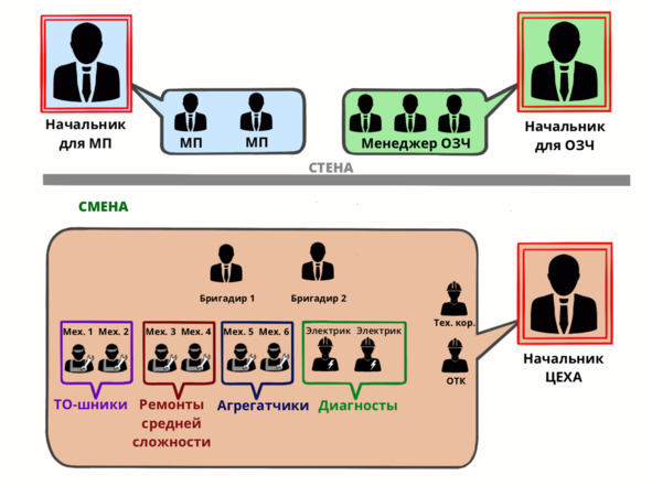 В такой структуре на весь цех приходился либо один, либо два бригадира. И в зависимости от того, какой механик свободен, тот или иной бригадир выстраивал и занимал ресурсы того или иного механика и выстраивал последовательность ремонта. То есть весь коллектив механиков приходился на двух бригадиров, и не было привязки конкретных механиков к конкретному бригадиру. Бригадиры были два равнозначных начальника для всех механиков. В принципе, такой подход давало вариативность и гибкость в построении планирования, в отличие от альтернативы, если бы за каждым бригадиром были закреплены только его конкретные механики. Но, с другой стороны, два разводящих на одном распределительно-командном посту зачастую сталкивались лбами.