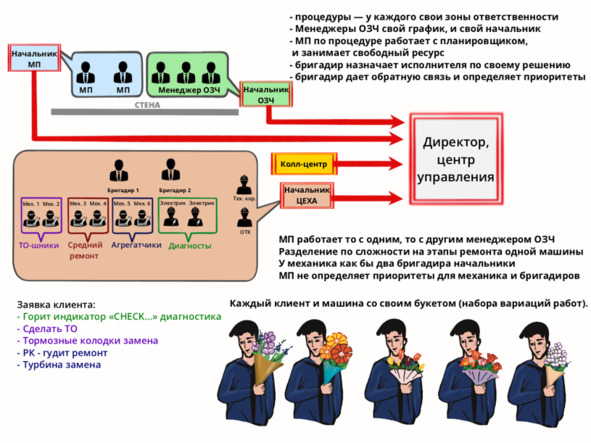 При такой постановке организации, тот, кто выстраивал всю эту схему, на мой взгляд, неэффективную, исходил из видения, где всё строго посажено в процедурный процесс. И получается, что МП мог вести сделку (в нашем случае ремонт конкретной машины), когда одна машина попадала то к одному бригадиру, то к другому. Эту машину в большинстве случаев делало несколько человек. И два самых печальных момента, вытекающих один из другого: МП не определял приоритеты ни для механика, ни для бригадиров, и вообще не мог управлять этим процессом.