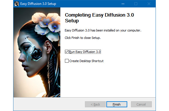 Be sure to check the «Create Desktop Shortcut» box and uncheck the «Run Easy Diffusion 3.0» box.