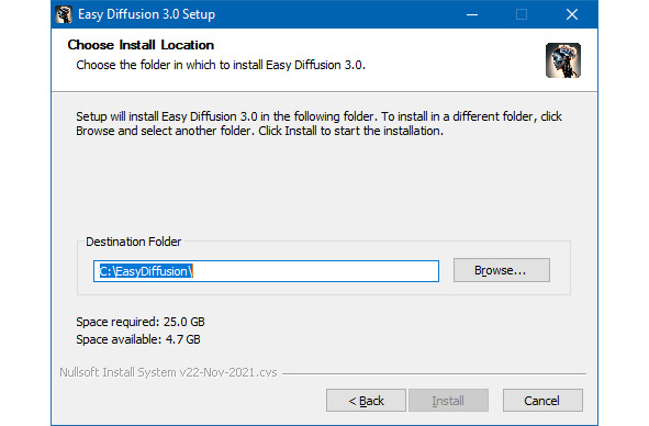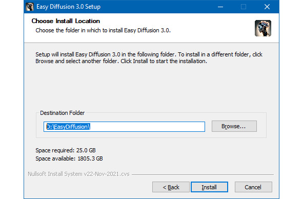 – The minimum amount of disk space (either on the «C:\” drive or on any other drive) is 40 Gigabytes (25 for Easy Diffusion and 15 for models). I recommend installing the program on a computer flash drive (not an external drive, but an internal drive of a computer or laptop). It will make image creation faster.