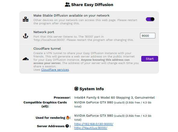 Three options control the network settings of your Easy Diffusion application. We don’t change them.
