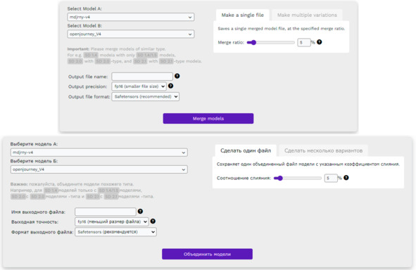 Using the «Merge models» window, you can combine different models with each other. For example, those that we downloaded after installation from the Internet.