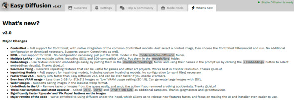 Following the «Models tools» window is the «What’s now» window. This window provides a list of all updates and changes that have been made to the current and previous versions of the Easy Diffusion application.