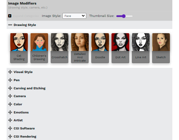 • «Image Modifiers» / «Image modifiers». A very useful button, especially at first, when you have not yet learned how to compose complex descriptions of new images. In the modifiers you can choose several different filters for your images: