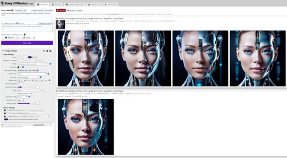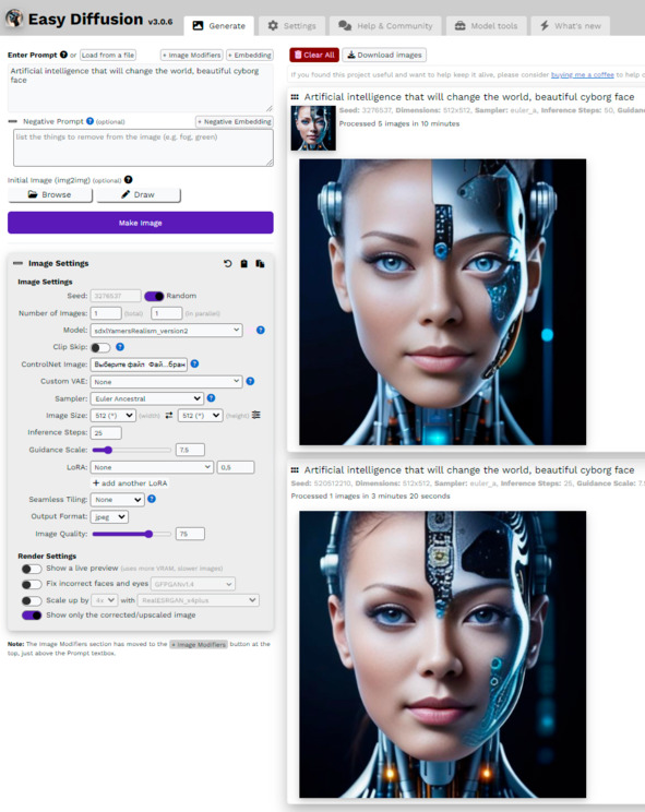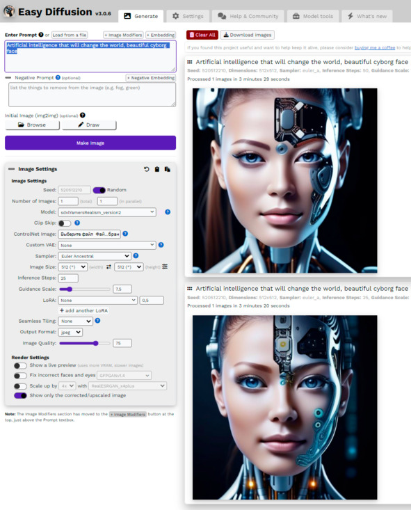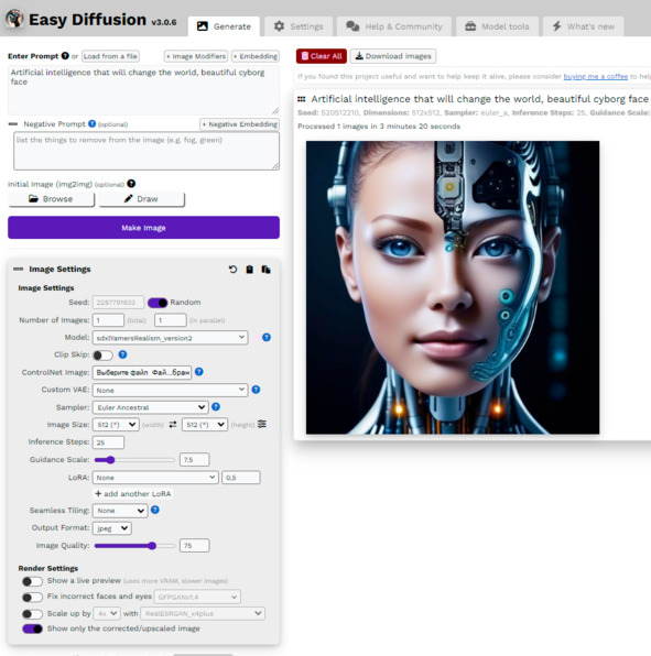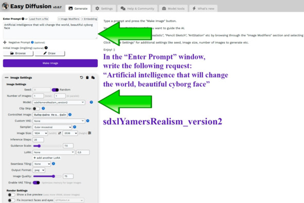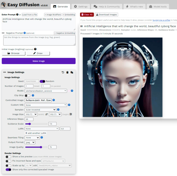 – In the «Enter Prompt» window, write the following request: «Artificial Intelligence that will change the world, beautiful cyborg face.» Please note that Easy Diffusion only understands queries in English. If you are not very good at it, please use any online translator available to you.