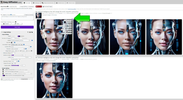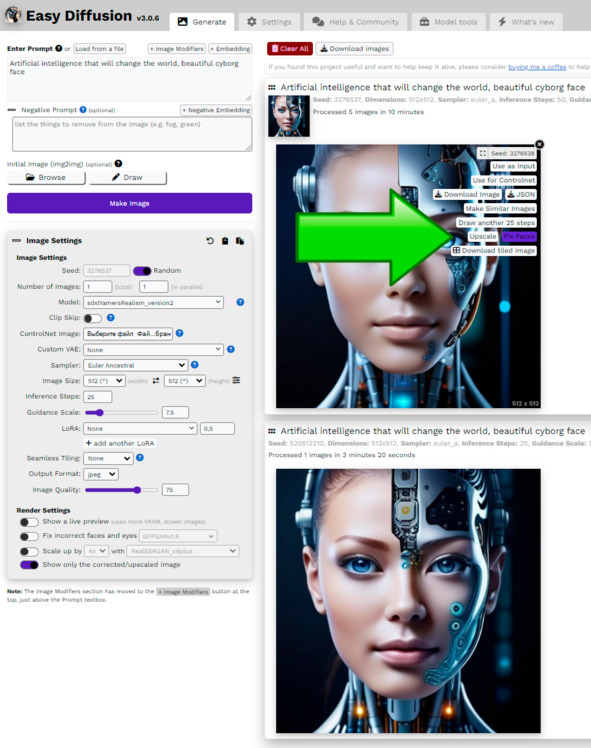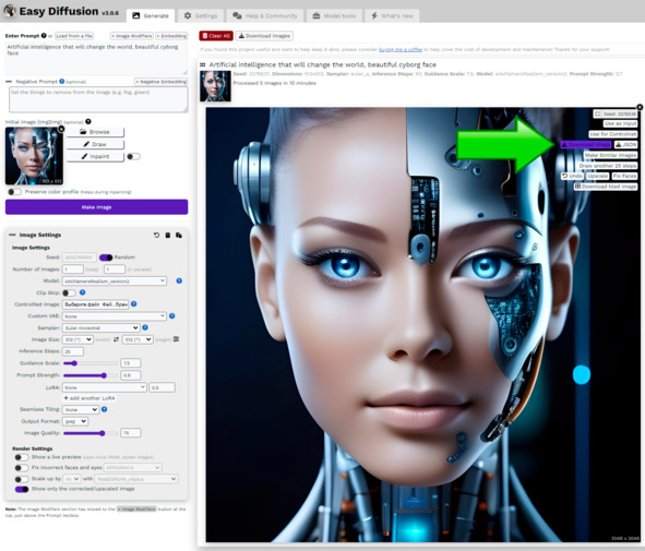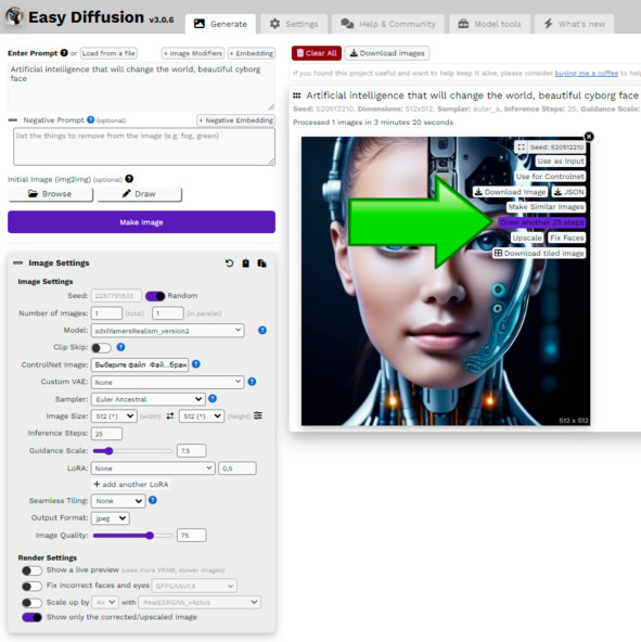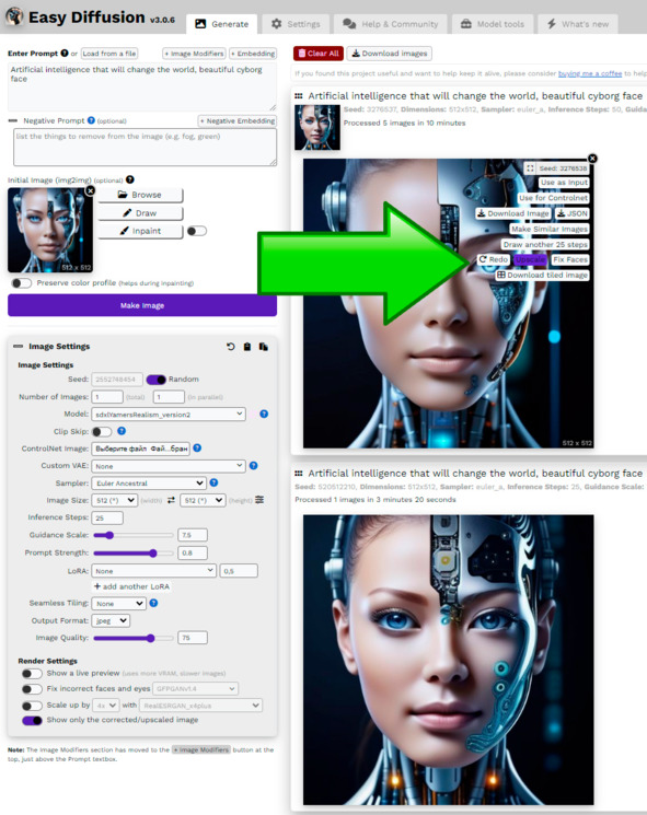 Let’s add a small clarification about the color of our cyborg’s eyes in the «Enter Prompt» window: «Artificial Intelligence that will change the world, beautiful cyborg face, green eyes», and also give the Easy Diffusion command to use our first image as the source (parent image) to create a new (child image): «Use as Input».