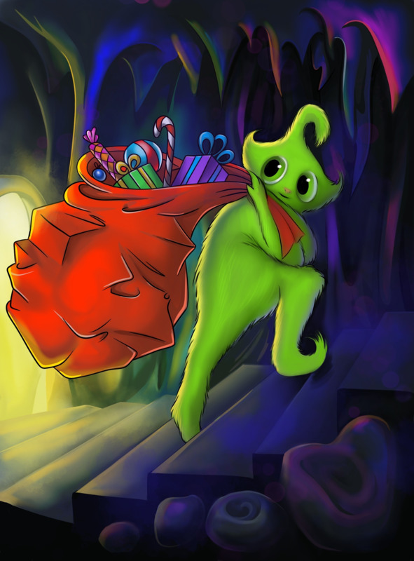 Я помню твое письмо, лежащее в морозильной камере. Как только я забрал его, сразу же поспешил на завод по изготовлению подарков. Мой завод делает миллион подарков в секунду, и твой подарок тоже был сделан очень быстро. Но случилось непредсказуемое! Глубокой ночью на наш склад, где хранятся все-все готовые игрушки, забрался противный Гринч из дальних стран и устроил там такой бардак, что нам до сих пор приходится отыскивать и возвращать ребятам подарки, которые они ждут с самого Нового года! Твой подарок тоже пропал. Я искал его везде: на заводе, на улице, на складе, даже у оленей в тележке, но не мог нигде найти. Оказалось, что Гринч прихватил с собой полтонны коробок с самыми лучшими подарками и убежал раньше, чем мы успели спохватиться.