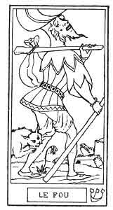 Есть ли указания на этот момент в картах Таро? Ну, поскольку речь идет о начале начал, то и смотрим первые карты. Здесь нас устроит колода Райдера Уэйда и более ранняя Oswald Wirth (два крайние справа). Великий Аркан №0 «Дурак».