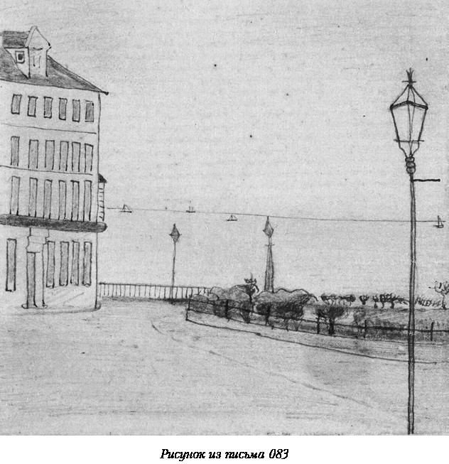 Прилагаю рисунок с видом из окна школы, откуда мальчики смотрят вслед своим родителям, возвращающимся на станцию после визита к ним. Многие [из них] никогда не забудут вид из этого окна. Жаль, ты не мог этого видеть на той неделе, когда у нас были дождливые дни, особенно в сумерках, когда зажигаются фонари и их свет отражается в мокрой мостовой.