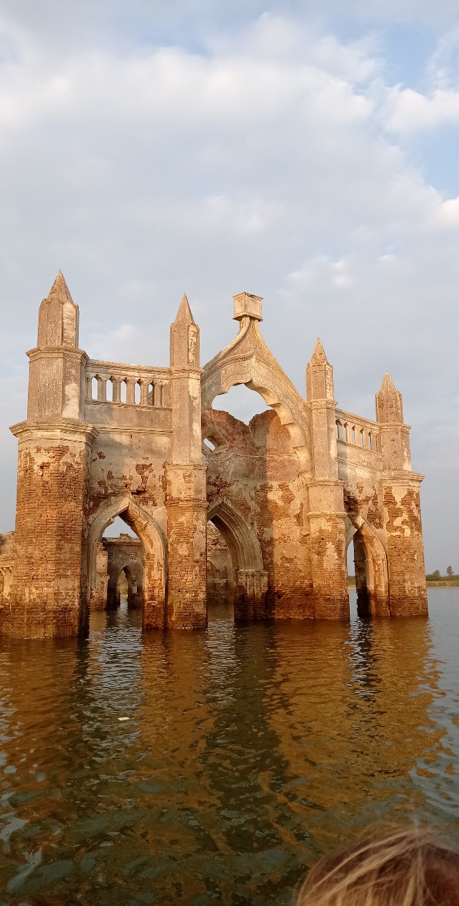 В сезон муссонов церковь погружается в воду и всплывает летом. Узнав об этом чуде, я готова была плыть туда на чем угодно, даже на тазике. Плавучий тазик и стал нашим средством передвижения между затопленными и величественными руинами. ⠀Не самый удобный транспорт, но очень романтичный.