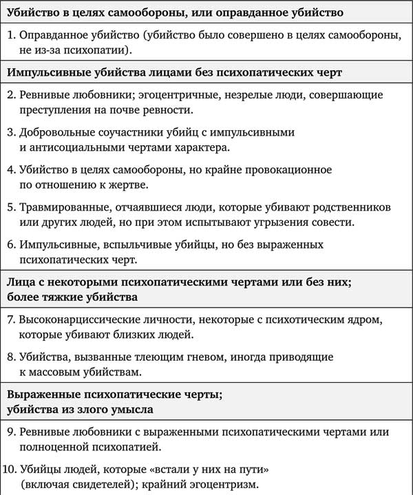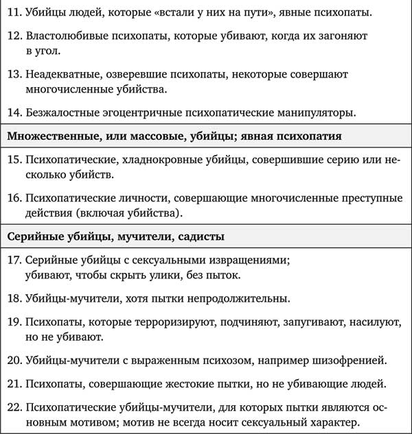 Согласно нашему опыту, при использовании этой шкалы люди, как правило, без труда способны понять первые восемь категорий, в которых лица без психопатических черт совершают убийства или другие серьезные акты насилия в целях самообороны или в контексте жестокого обращения, импульсивности, сильного чувства ревности или злобы. Категории с 9-й по 22-ю оказываются более сложными для понимания, поскольку требуют перехода от ясных, ситуативных и человеческих мотивов к мотивам по своей природе эгоистичным, извращенным и жестоким до степени, непостижимой для обычного человека. Кроме того, для понимания этих категорий необходимо быть хорошо знакомым с такими психологическими понятиями, как психопатия, нарциссизм, психоз и садизм, и уметь различать их между собой. Все понятия мы подробно обсудим в следующих главах данной книги.