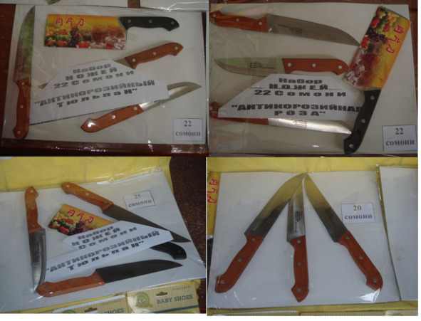 Среди всего прочего тут были кухонные ножи разных размеров, ролики для детей, обувь мужская и женская, сумки, скорее всего для детей дошкольного возраста, также шляпки и панамки детям, пинетки двух цветов, мужские галстуки, пластиковые сумки-файлы, и ещё кое-что.